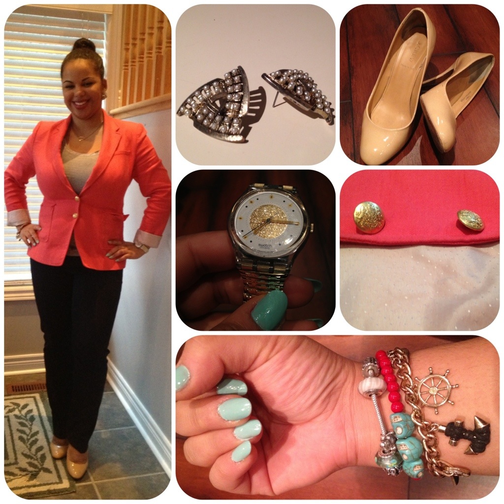 Blazer – Banana Republic; Top – JACOB; Trousers – GAP, Heels – J.Crew; Earrings – vintage; Watch – vintage Swatch; Bracelets – Pandora, Brandy Melville, Joe Fresh; Nail Colour – Cheeky Monkey Cosmetics in Get Wet