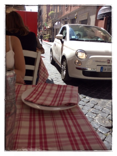 After heading towards Spanish Steps (for a second time – seriously going up and down 135 steps when it’s 30+ degrees outside…too much!), it was time for lunch. At this point I was ready to sit down and stay sitting down! I also love how the cars were just casually driving past as people were eating lunch on the side street.